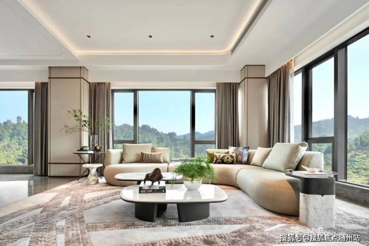 这套样板房由著名室内设计大师、维几设计总设计师黄全先生亲自操刀。约66平米的环幕横厅是这套房子的精华所在。