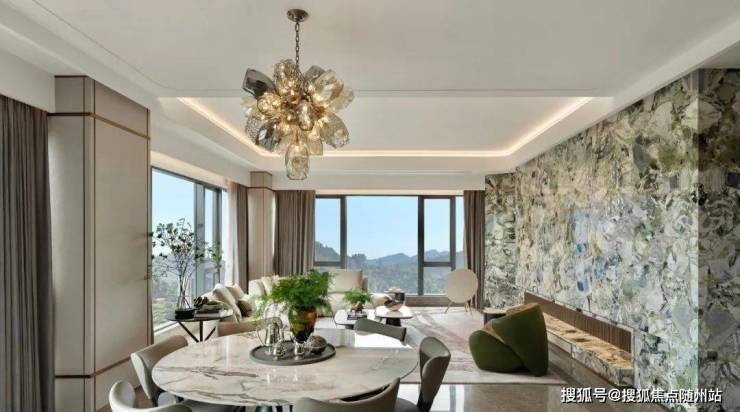 据说光这一面墙,市面价格1万/㎡+!一进入约310㎡样板房,独立玄关处那一席醒目“冷翡翠”石材,就攥住了所有人的视线。不仅纹路氤氲、色系华美,还同时满铺在了客厅背景墙上,价值20万!