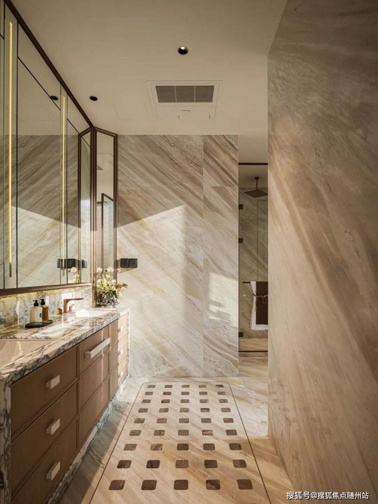 台盆柜区域采用意大利大花白石材铺装,其余墙面、地面材质为希腊伯爵白石材。不计成本的精工铺装,尽显开发商对产品的极致追求。