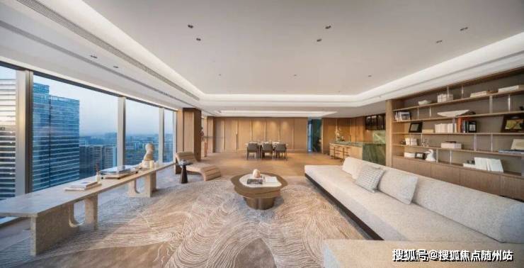 从会客厅公区到雅奢私境,目之所及,时代人物的气度、眼界、格局,都被空间具象化的表达出来——约22.6米南向大开间,配合8.6米客厅极致面宽,让光线与空间自由流动,每一处细节皆被温柔点亮,勾勒出通透而恢弘的生活场景;建面约112㎡一体化餐客厅,以奢阔格局承载时代人物的气度与胸襟,成为家族聚会与高端社交的理想场域;约270°无界环幕视野,搭配3.8㎡整块巨幕玻璃,宛若悬立于城市上空的观景甲板,将中轴万象峰景从容尽收眼底。