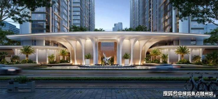 项目的北面紧挨着河道,主要出入口位于西面景兴路,,通过钻石型大堂进入下沉式庭院。南面思凯路上也有车行入口,做了景观构架。项目内部整体采用首层抬高的设计,打造了多层级豪华水系景观,全区风雨连廊连接。