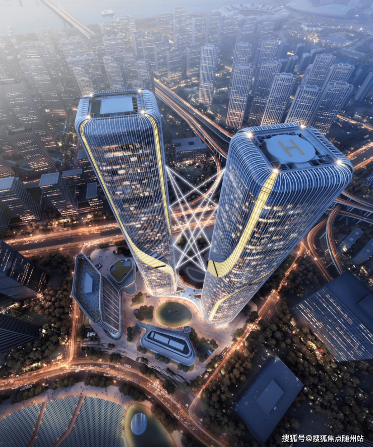 项目邀请国际知名大师团队EID ARCH首席建筑师姜平,通过双子超塔的建筑形象将智慧之门以抽象化的形式呈现出来。作为地块南侧城市轴线的终端, 双子塔的门户形象回应基地周边的城市空间关系,与整体的城市设计相协调。