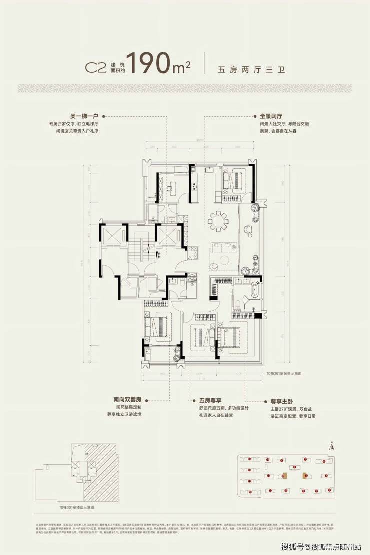 建面约190方C2户型,五房两厅三卫