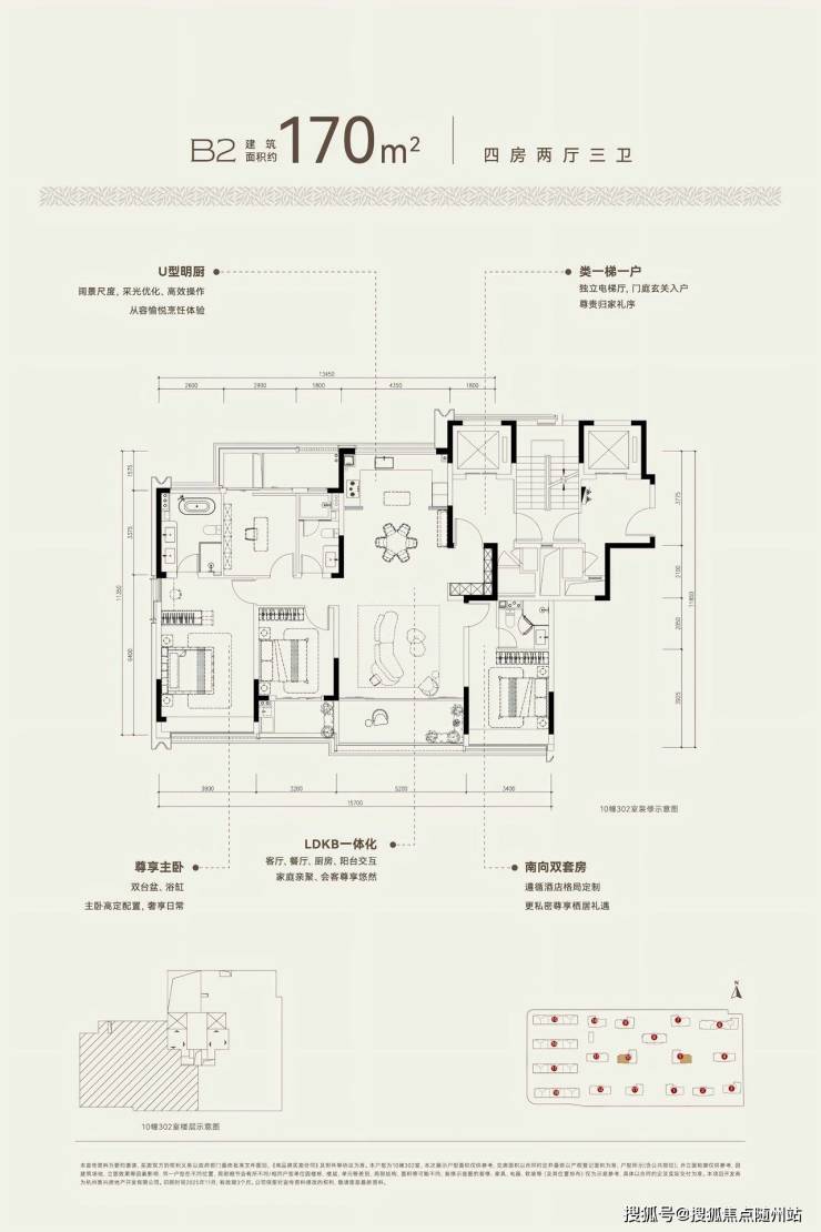 建面约170方B2户型,四房两厅三卫