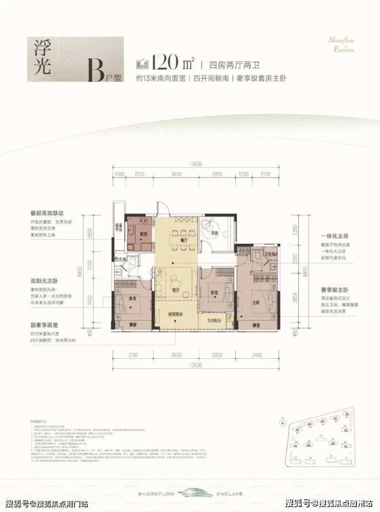 约120㎡B户型做到四开间朝南,约13米南向面宽搭配双联阳台,套房主卧与双飘窗设计营造大平层气场。