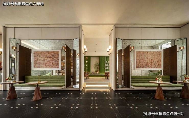 瑰丽元素,成为贯穿全局的风格标识,同款的通高玻璃格栅、泥客石荔枝面墙壁、云石壁灯,以及黑白棕三色石材的几何拼花地板,穿越时空遥相呼应。