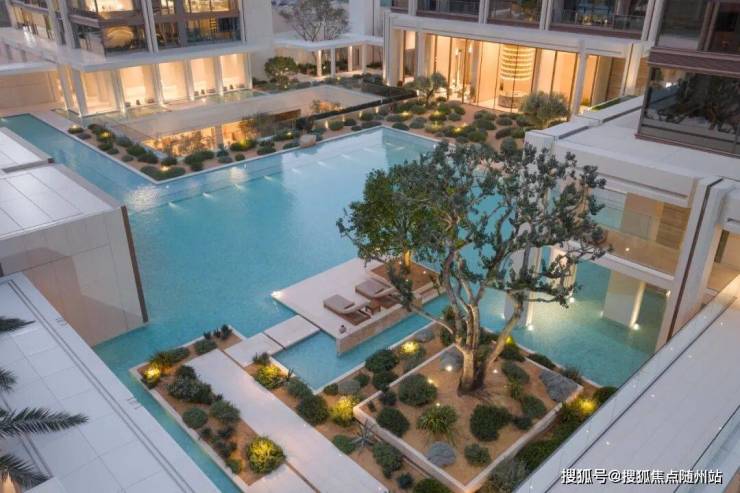 会所环绕回香水庭与几何艺术绿谷,米色岛礁石、油橄榄与点景水韵交织,勾勒地中海浪情调。