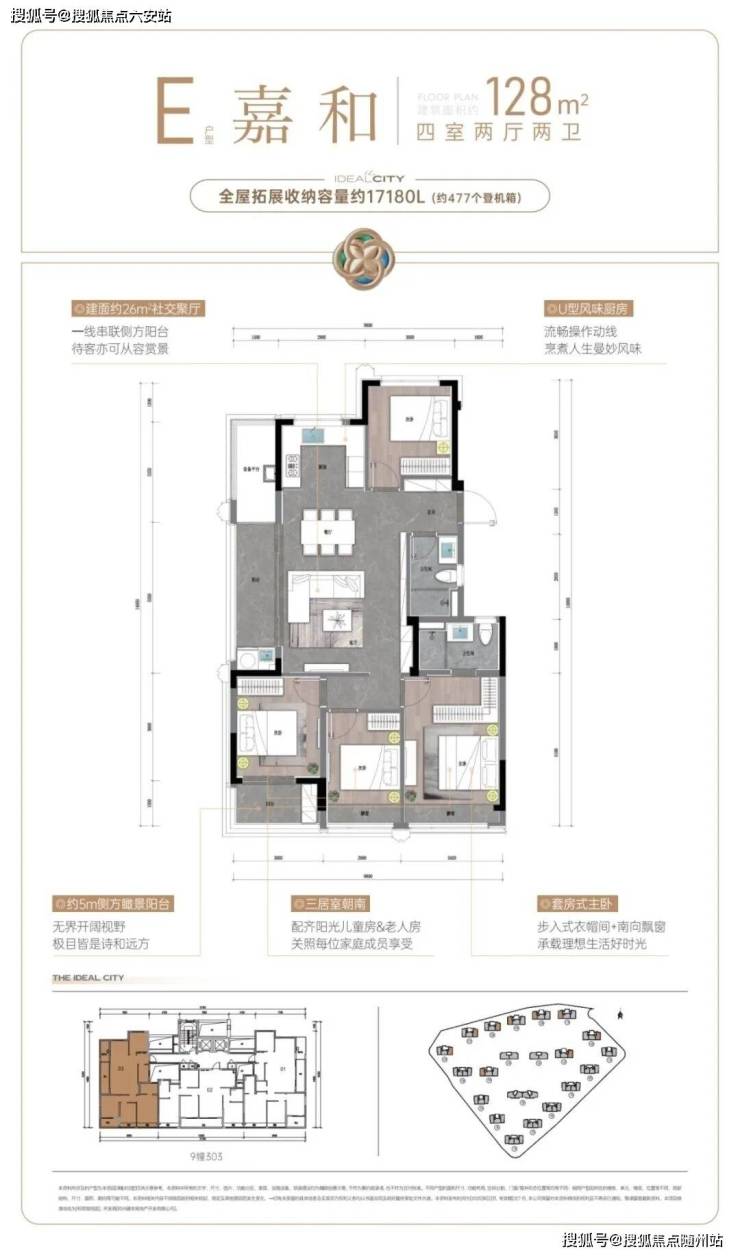 阔绰方厅+双联阳台,通风赏景至佳,还有U型厨房,三面操作空间,动线流畅好用;套房式主卧更配置了步入式衣帽间,独立卫浴设计,保证了主人家的隐私和仪式感。