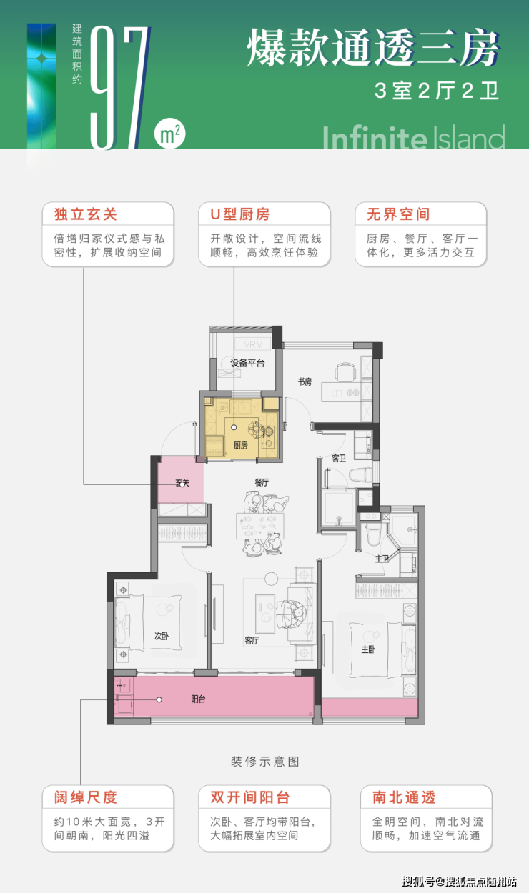 建筑面积约99平方米的创意样板间,半开放式的餐厨设计,打破了传统“一人做饭,全家等待”的局限,畅通了家庭交流空间。