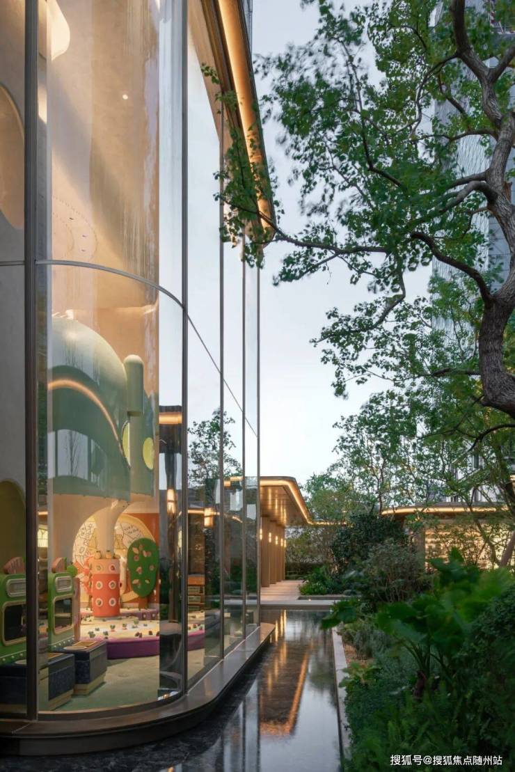 泛会所内部除会所功能之外,设置近500方的超大儿童区。将8m通高的童玩攀爬区置入10m的悬挑玻璃盒子内,漂浮于水面之上,如同一颗巨型艺术胶囊,也成为整个庭院的视觉焦点与活力中心。