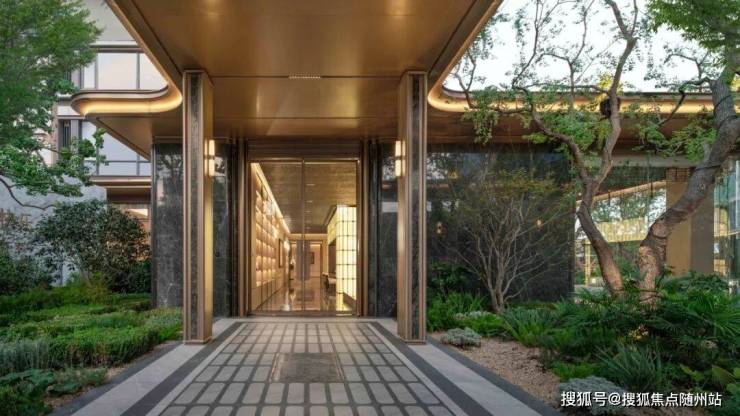 主入口空间向内退让,形成有温度的城市边界。52m超长门头水平横向舒展,既遵循中轴对称的传统礼仪范式,又以简约线条、奢华材质与极致工艺呈现艺术、轻盈的雅奢格调。前场庭院以“洄游”为理念,重构“四水归堂”的空间序列。