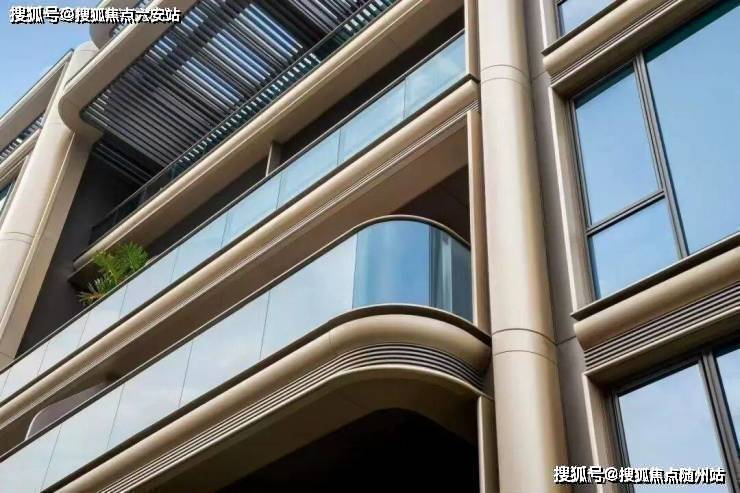 高层立面用上了大面积铝板与玻璃相结合,配合斜切工艺和“油画框”式设计,提升采光与景观视野。香槟金色铝板搭配斜切工艺,阳光下建筑通体镀上一层暖金色,金属铝线修饰的窗景宛如嵌在“金色画框”中。