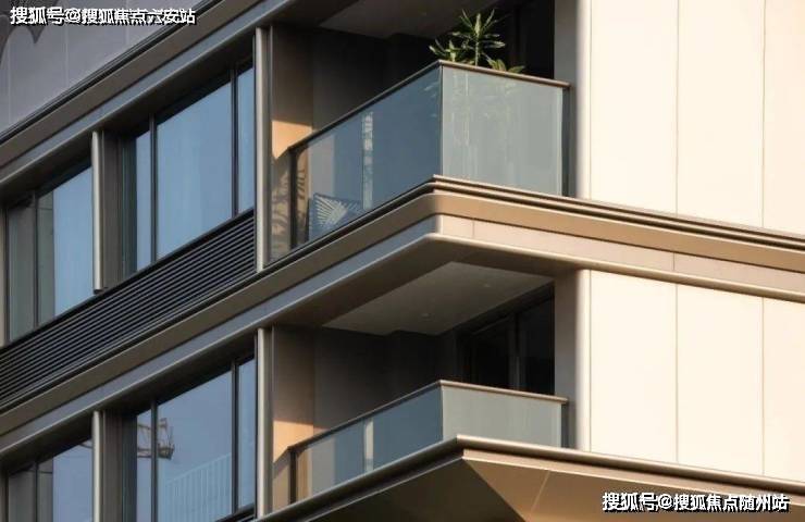 高层立面用上了大面积铝板与玻璃相结合,配合斜切工艺和“油画框”式设计,提升采光与景观视野。香槟金色铝板搭配斜切工艺,阳光下建筑通体镀上一层暖金色,金属铝线修饰的窗景宛如嵌在“金色画框”中。