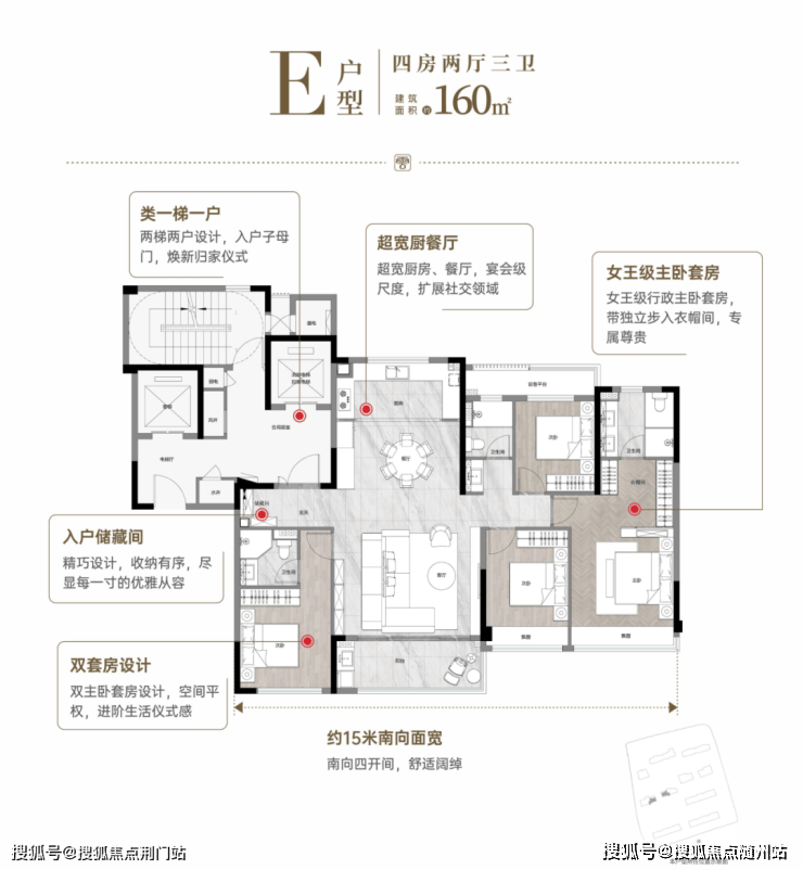 建面139㎡户型,客厅超5米的南向四面宽,大开间短进深设计,主卧带L型转角飘窗,独立全明衣帽间,尊贵感强。建面约160㎡户型南向超15m,四房三卫格局,L型步入衣帽间,更好的私密感。