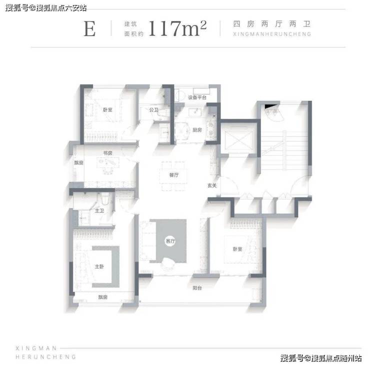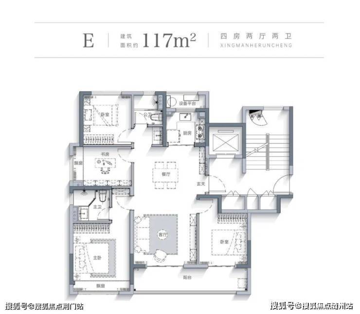 约117㎡户型点评:全明方正通透, 提升空间利用率,LDKB一体,营造大尺度餐客双厅, 亲朋从容相聚,双开间观景阳台, 晾晒之余, 亦可成为兴趣天地,四房功能, 让家庭成长的理想一步到位