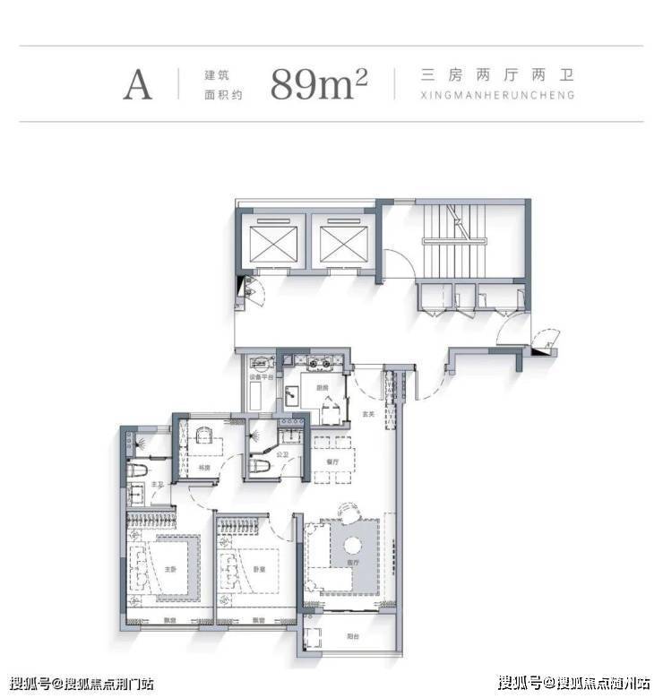 星缦和润的约89㎡洋房户型是1梯2户,不仅南北通透,格局也是3开间南的“飞机户型”。