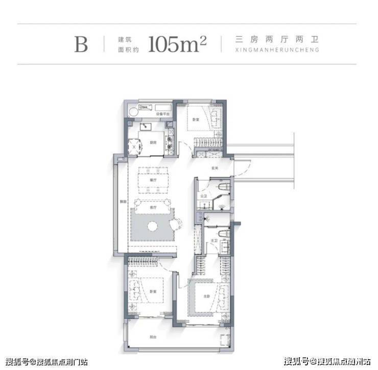 在北侧多了一个卧室,同时临近公卫,有了小套房的即视感。南向的餐客厅和次卧,则连接了一个双联阳台。