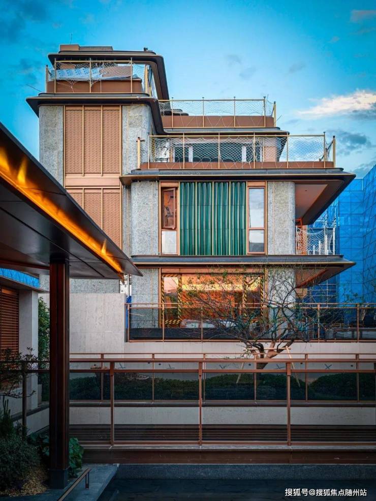 在建筑上,如玺华院以天青色陶板,致敬杭州的宋韵文化,演绎“雨过天青云破处”的意境;观锦宸樾府用伊朗红洞石,唤起当地人对临安鸡血石文化的情感共鸣,呼应“鸡血一滴避邪气,得此宝贝最吉祥”的民间佳话;运河樾用蓝色景泰蓝搭配弧形陶板,再现运河的波光,诠释“春来江水绿如蓝”的江南意境。