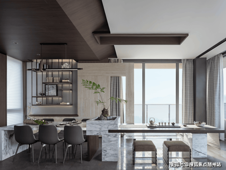 独立前院和礼仪玄关入户,一出电梯门,只见餐客厅和书房一字排开,面宽达约19.8米。一个环绕式超级露台,长度达约30米!设计糅合山居生活与当代设计风格,以静谧优雅的风格诠释国际现代奢华的诗性与意韵。