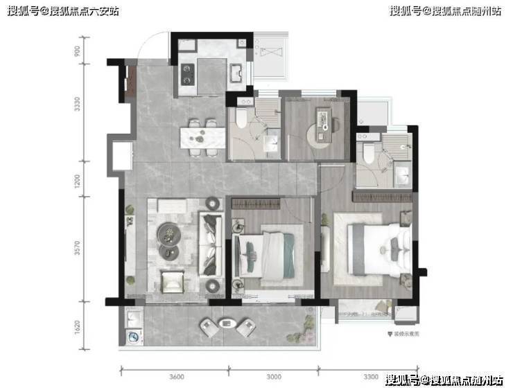 双玄关的设计,让归家更有仪式感,收纳空间进一步增加。入户后阔气的餐客厅,联通约7米的跑到式大阳台,给人一种置身于大平层的尺度感。