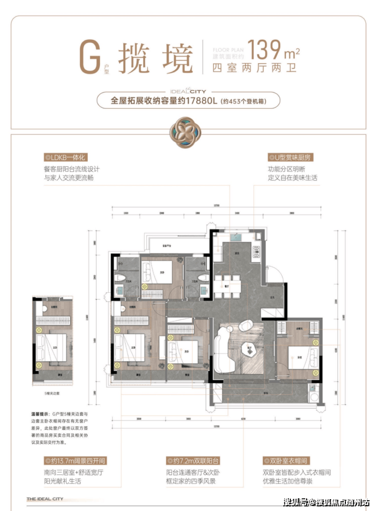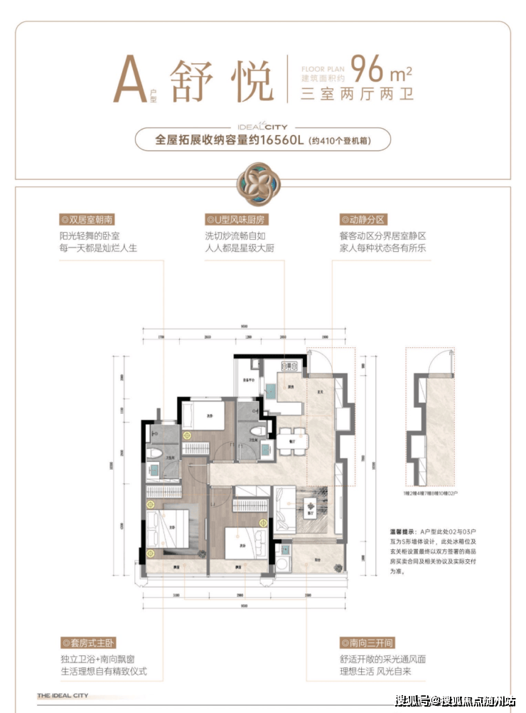 建面约107㎡户型,则把重点放在舒适度上。阔绰方厅+双联阳台,通风赏景至佳,还有U型厨房,三面操作空间,动线流畅好用;套房式主卧更配置了步入式衣帽间,独立卫浴设计,保证了主人家的隐私和仪式感。