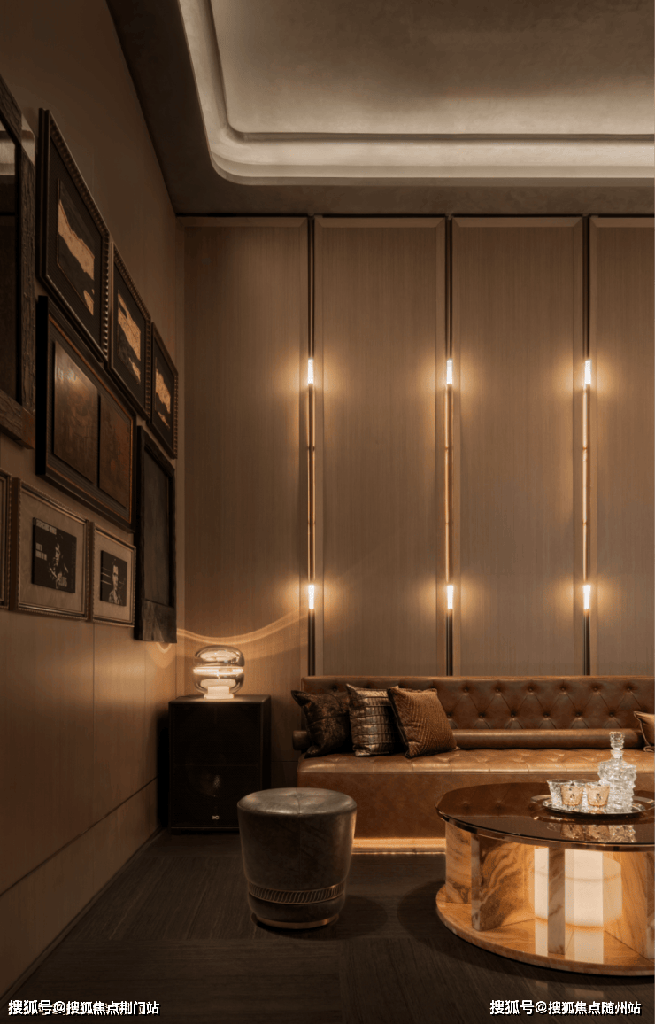 水纹玻璃茶几内嵌发光云石和艺术墙以当代笔触与中西音乐元素交织,打造出独特的摩登质感。