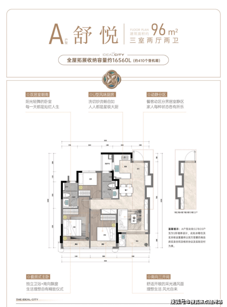 建面约96㎡户型,虽是入门级产品,但空间感丝毫不输大面积。三开间朝南,阳台+双飘窗,采光、通风兼优;双卫配置、主卧套房、S墙预留空间,动静分区合理。