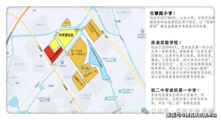 古墩路幼儿园,古墩路小学,杭二中(余杭校区),良渚实验等。(以交付教育部划分为准)