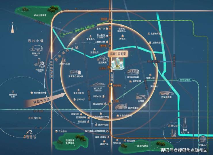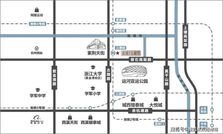 蓝城云和里坐拥杭州主城顶配全维生活配套,实现繁华与生态、烟火与格调的完美平衡。商业配套上,项目下楼即达龙湖紫荆天街,3 公里范围内汇聚城西银泰城、西溪天街、万达广场等8 大核心商圈,一站式满足高端消费、休闲娱乐等全场景生活需求;生态配套上,项目直线距离约500 米对望700 亩大运河亚运公园,推窗即揽城市绿肺,近享 7.2 公里绿道与生态湖景;教育配套上,毗邻浙江大学紫金港校区、西湖大学等顶尖学府,高知氛围浓厚;医疗配套上,直线1.5 公里可达三甲医院浙江医院三墩院区,为全家健康保驾护航;产业上,背靠紫金港科技城,汇聚阿里云全球总部等235 家高新技术企业,千亿产值赋能,为项目注入持续的价值势能。