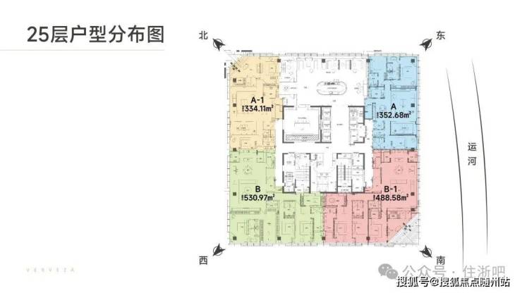 项目标准层高4.2米,26层顶楼高达4.8米,通过全景落地窗将运河天际线引入室内,重构空间尺度与视觉美学。区别于传统大平层,项目以“社交场域”为设计导向:26层顶层规划空中会客厅,标准层配置可变空间布局,满足商务宴请、艺术展览等多元需求。