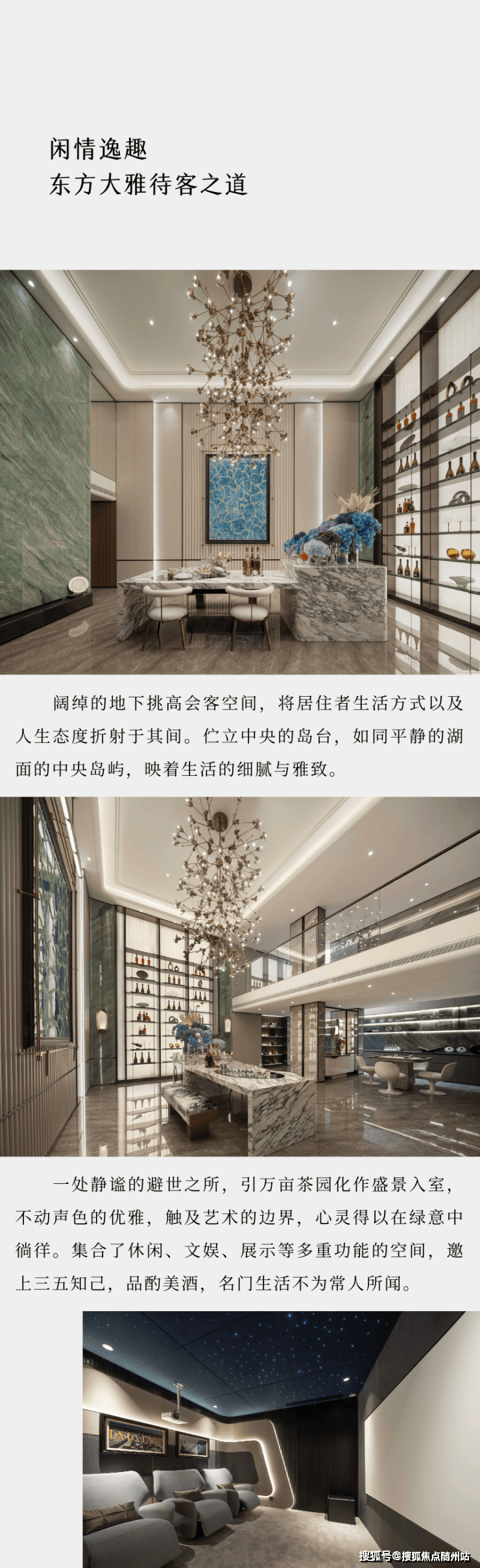 地下空间,以古时的「雅集」为灵感,打造了一个氛围柔和舒适的休闲娱乐空间,挑空的设计,让空间显得大气非凡,顶面延续了之前紫禁明月中的方格金箔顶,墙面的大块水墨玉石,宛若矗立山林间。
