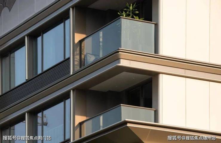 香槟金色的铝板搭配斜切的工艺,不但金贵感十足。阳光下,建筑通体像被镀上了一层暖金色,加之金属铝线的修饰,窗景宛如嵌在“金色画框”中。