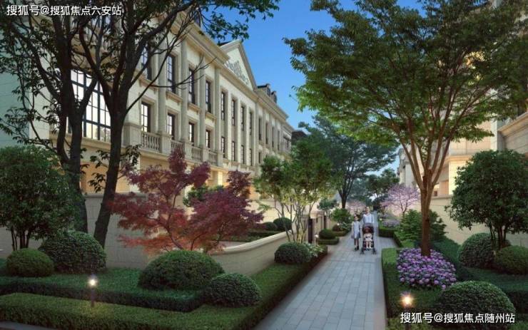 整个园区,以经典的绿城法式墅区景观大中轴贯穿,占地约1000多㎡,联排建筑的设计,融合了中国传统院落布局与法国枫丹白露宫的审美,外立面大面积采用全石材干挂,檐口等细节部位使用仿石。