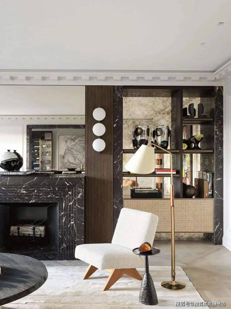 餐客厅尺度达到了惊人的16米,97m²,用一席壁炉做了视线分离,米色的洞石、自然冰裂纹的艺术漆。背景墙拱形胡桃木的静谧,地板拼花木格纹的精细,沙发钢琴键织布的韵律,营造的是回归生活本质的轻松写意。
