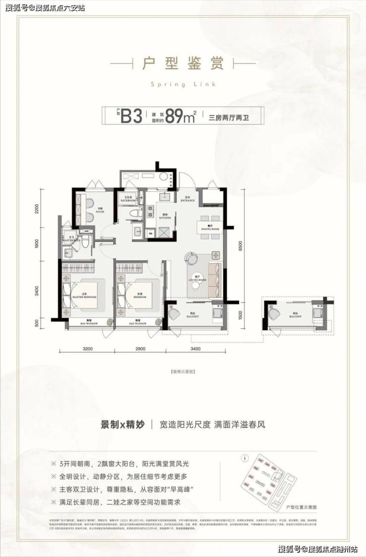 建面约89㎡的三房户型,三开间朝南,设计出了两条平行生活动线,巧妙地形成了一家人共聚的公区,以及由主卧、套卫、书房的“第二客厅”,满足年轻家庭的居住需求。
