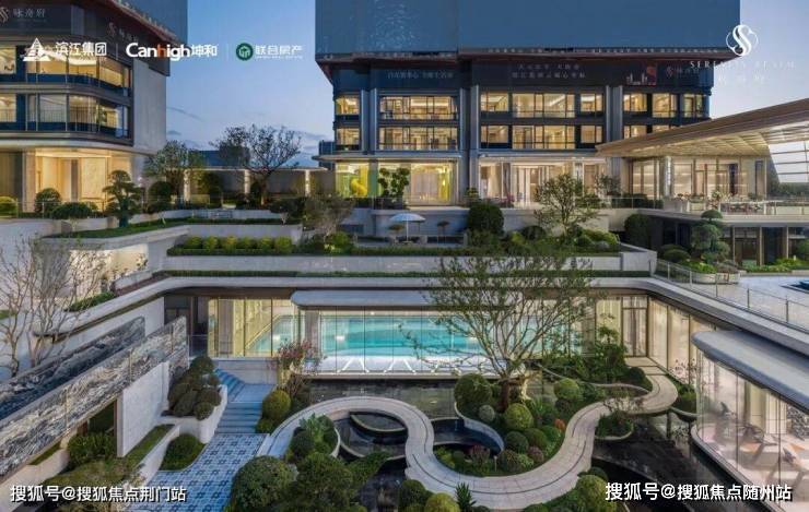 下沉式CLUB是一大亮点:一个“浮岛”般的玻璃BOX轻盈置于景观之中,内含恒温泳池、健身房、网球室、party房等多功能社交空间,结合跌瀑水景,打造出静谧与动态交融的度假式体验。