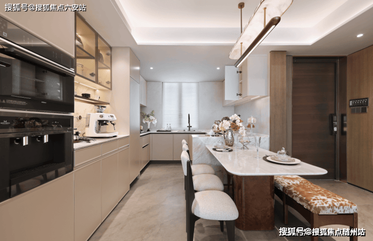 厨房配备老板五件套(三眼灶、蒸烤一体机、洗碗机、油烟机、前置过滤器)等高端厨电,预留双开门冰箱位,周全考量下厨与用餐体验;