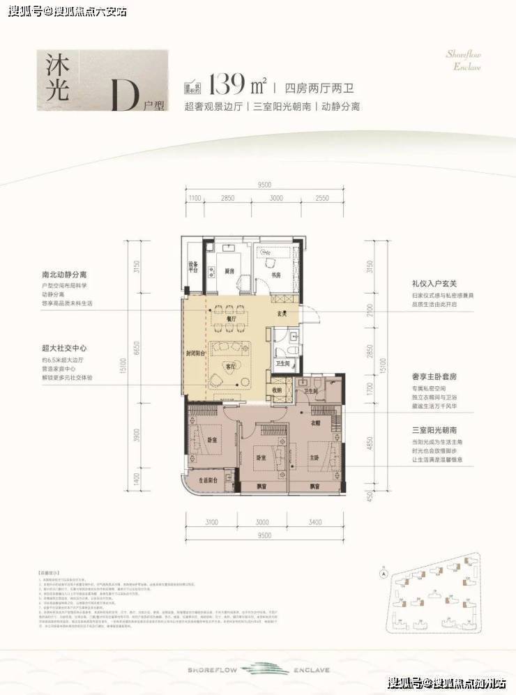 这款户型堪称四开间朝南的“流量王者”,南向面宽约13米,双联阳台+双飘窗设计,视野和采光优秀;套房主卧、双阳光次卧,颇有大平层的气势。