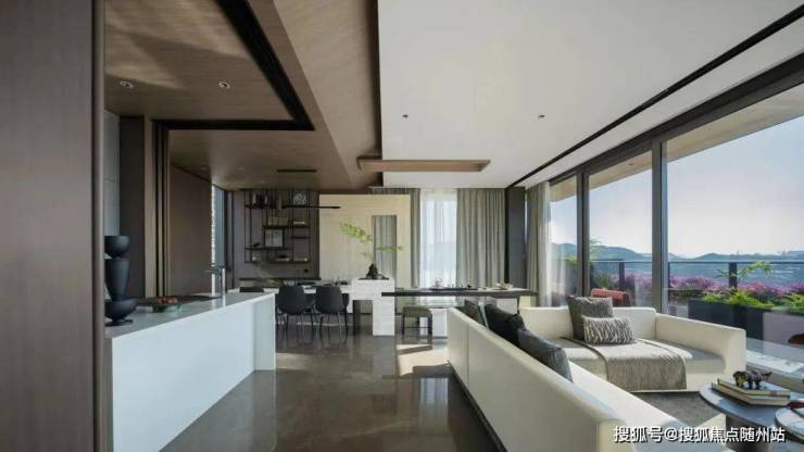 由独立前院和礼仪玄关入户,一出电梯门,只见餐客厅和书房一字排开,面宽达约19.8米。一个环绕式超级露台,长度达约30米!由跑道露台、挑高中庭和空中花园连缀而成。