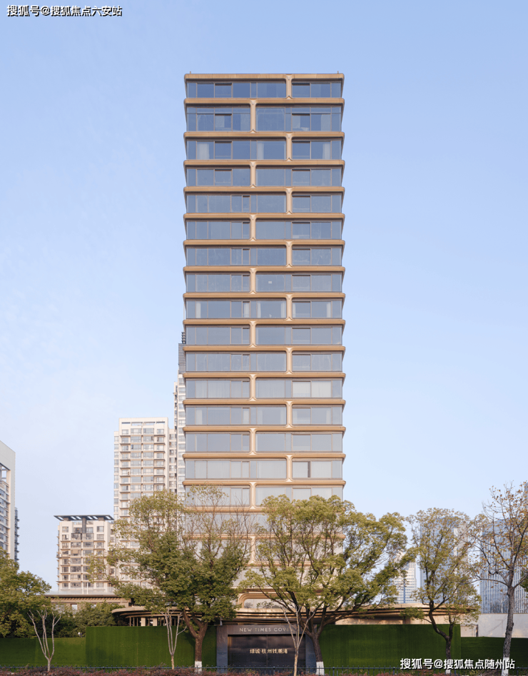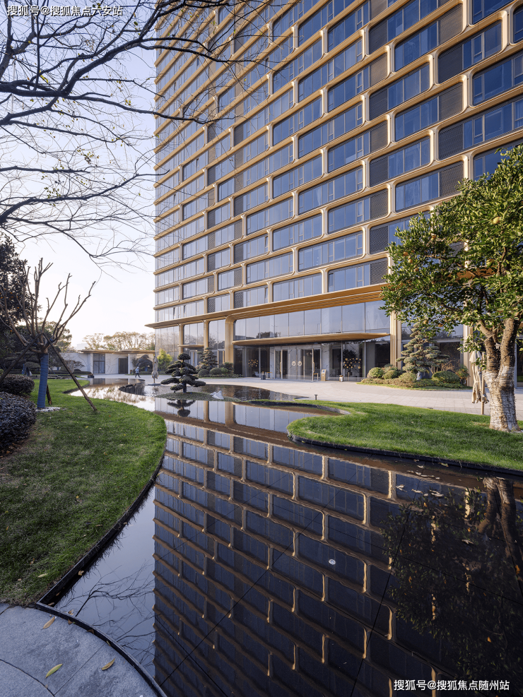 外立面以金色铝板曲面线条呼应钱塘潮涌,定制玻璃幕墙经十余次实体挂样测试,兼顾美学与功能。