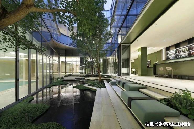 入户大堂的负一层,与下沉庭院相结合,共同组成建面约1200㎡的会所,恒温泳池、健身房、瑜伽空间、童玩区等一一备齐。