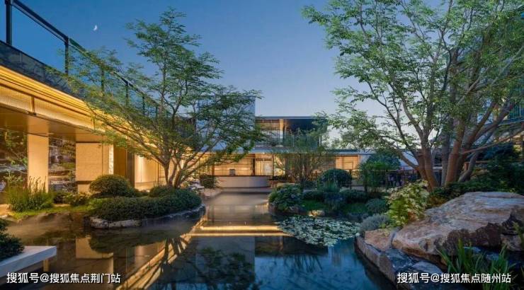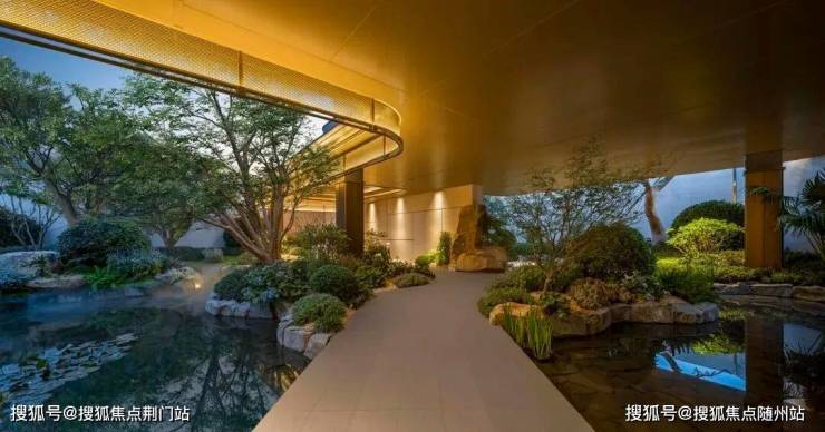 景观以「四境四巷」铺陈东方礼序,「五重归家」轴线串联宽约128米恢弘门庭、约15米叠石飞瀑、约13米榫卯转译的现代穹顶等。约1300㎡下沉式庭院采用三层立体观景设计,15米叠石飞瀑再现《溪山行旅图》的山水意境。