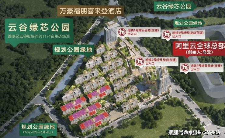 项目自带约3.88万方商业综合体,一幢已经签约万豪福朋喜来登酒店,以及主题商业街区、企业办公总部,全都和地铁站零距离。项目旁边还有千亩云谷绿芯公园、云谷学校等,未来价值不可估量。