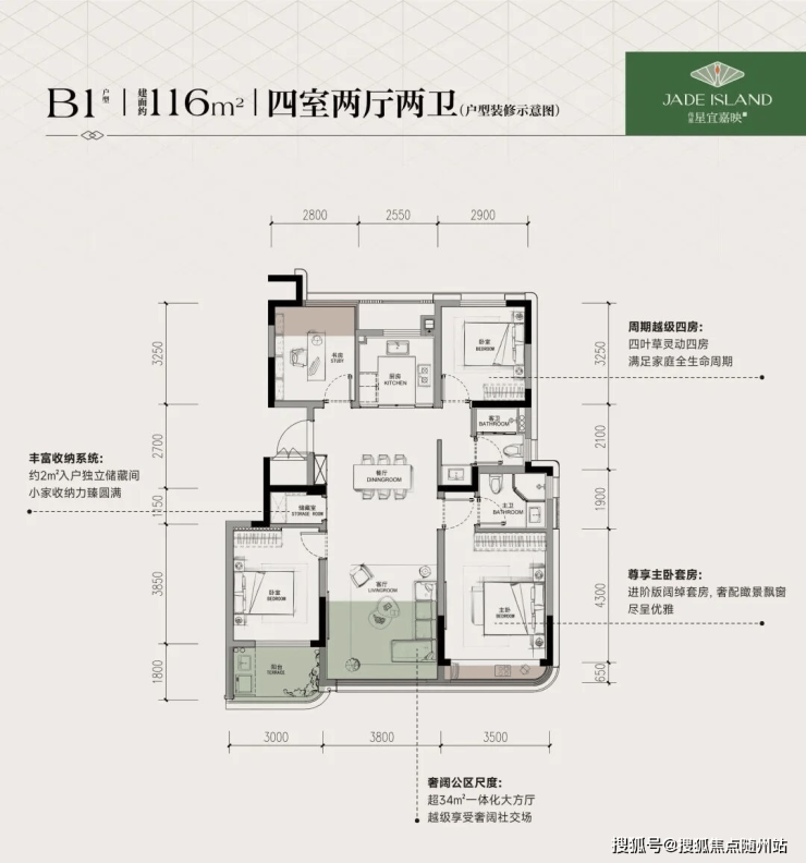 2. 功能越级:在同面积段罕见地做到了四房,并配有约2㎡的独立储藏间。