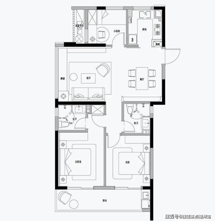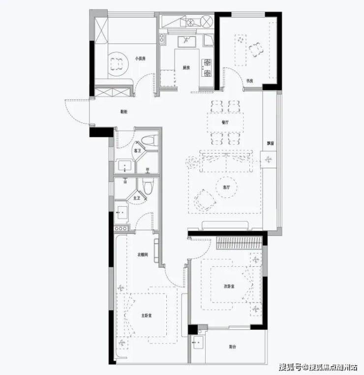 约111㎡边套:创新做到四房设计,全屏开放式餐客厅面积近30㎡,搭配大飘窗,尺度宽松 。