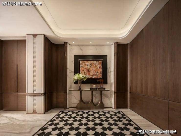 临街地面水池由黑金花石材铺就,7个贝特白石材立柱形成琴弦意向,车库内部则通过顶面雕刻装饰铝板与金色铝板立柱强化豪宅氛围感。艺术与自然融合方面,大堂内设有花间画廊,引入高端品牌花店SIAFlora营造自然生机;