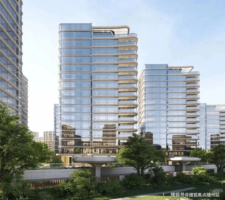 外立面采用弧线转角阳台+蓝灰色钢化LOW-E玻璃,公建化立面拥有超高窗墙比。同时,大量曲线元素的运用,不仅造价昂贵,而且极具辨识度,成为区域的颜值担当。