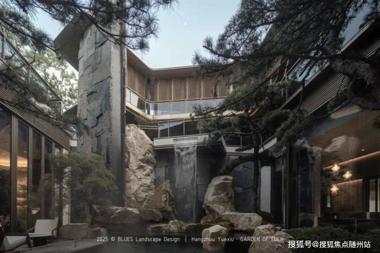 如玺华院还是杭州第一个采用架空平台层的低密项目,这使得园林景观更为立体丰富,15米高差的叠石飞瀑与亭台楼阁、檐下游廊、小桥流水互相映衬。