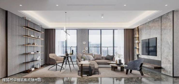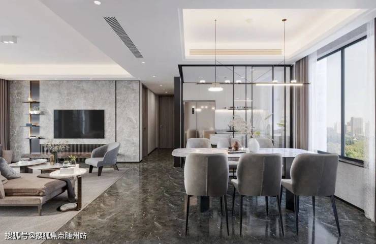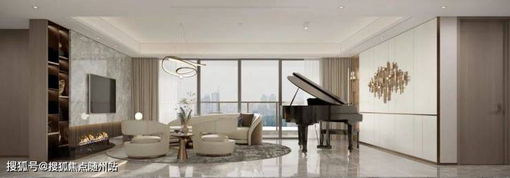 约7米巨幕观景横厅把整个公共空间串联起来,敞开的格局平衡空间的功能性、完整性与互动性,大大提高了生活的尺度感与交互性。