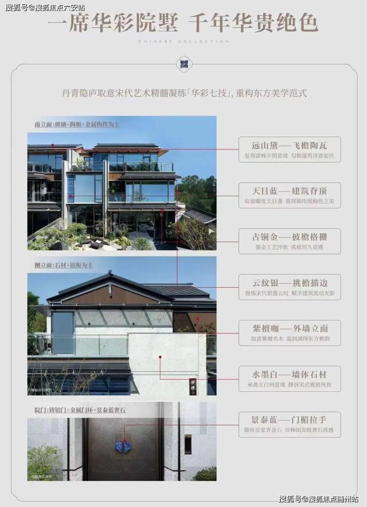 ❍披檐格栅-淬火古铜金:源自经典鎏金工艺,带来观感和触感的恒久之美。❍外墙立面-繁星紫檀咖:取意满天星紫檀名木,温润厚重的暖调诠释东方雅韵。❍墙体石材-丹青水墨白:承袭丹青水墨空灵之美,静诉千年宋式的泼墨风骨。❍门楣拉手-御制景泰蓝:还原御用珐琅彩景泰蓝,诠释国宾级奢石质感。